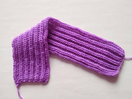 Вяжем полотно до нужной длины. Эта длина равна обхвату головы. Но при этом следует учитывать, что получившийся шарфик нужно измерять в немного растянутом состоянии, чтобы в итоге повязка хорошо сидела на голове и облегала ее.