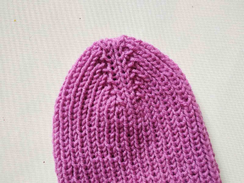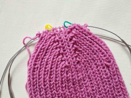 Вяжем шапку желаемой высоты. И затем начинаем убавлять макушку. Для этого нам нужно выделить 6 петель: 3 спереди и 3 сзади.