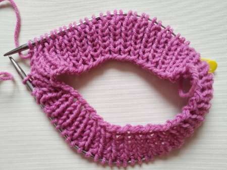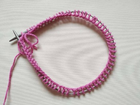 Шапочка вяжется очень просто и быстро. Набираем на круговые спицы петельки, количество которых должно делиться на 2. И этого числа петель должно хватить на обхват головы.