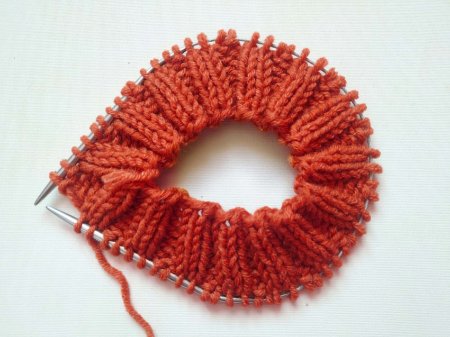 И для этого перейдем на лицевую гладь. В первом ряду мы сократим количество петель вдвое, провязав по 2 петли вместе.