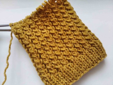 Начинаем после резинки вязать первый ряд узора. Провязываем 1 изнаночную петельку, затем вяжем 2 лицевые петли. Снова повторяем 1 изнаночную и 2 лицевых. Продолжаем так вязать, пока не закончим ряд.