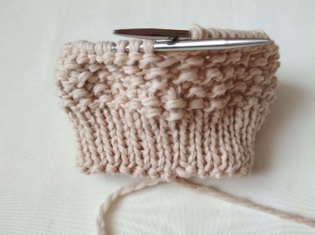 Затем переходим на основной узор. Провязываем ряд, выполняя только изн.п. В начале ряда ставим маркер. Это 1 ряд узора. Провязываем снова ряд резинкой 1/1. Так выглядит 2 ряд раппорта.