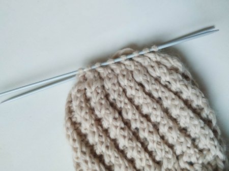 Шапочка будет с отворотом, поэтому будем вязать резинкой 1 на 1 на нужную высоту. Вяжем столько рядов, сколько нужно, учитывая желаемую высоту отворота. Чтобы резинка была одинаковой с обеих сторон, изнаночные петли провязываем за заднюю стенку.