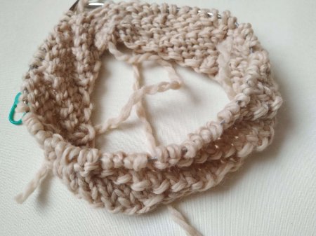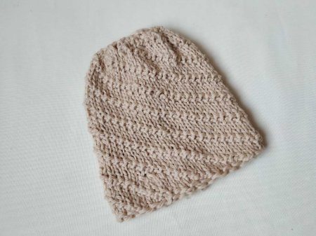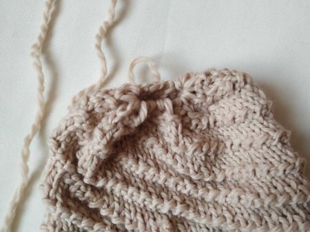 Затем убавляем, провязывая 3 лицевые вместе, затем 2 изнаночные. Провяжем ряд 1 лицевая и 1 изнаночная. Свяжем последний ряд, провязывая по 2 петли вместе лицевой. Оставшиеся петли стянем ниткой.