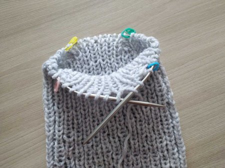 Далее вяжем до следующего маркера и поступаем так же. Вяжем затем снова резинкой. И опять делаем по 1 убавке перед и после маркера.