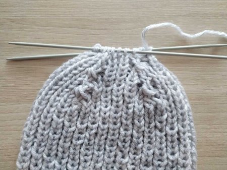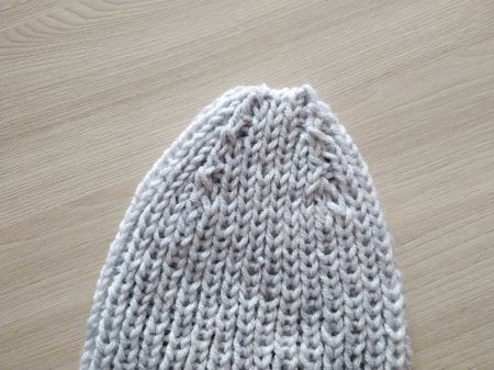 Затем оставшиеся петли распределяем поровну на 2 чулочные спицы. Распределяем их так, как должна лежать шапка. Сшиваем невидимым швом.