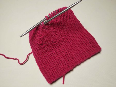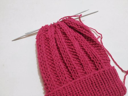 Теперь будем закрывать макушку, делая убавления. Вяжем 2 петли вместе. Какой петлей зависит от того, как закончен предыдущий ряд. Если связано изн, лиц, изн, то провязываем 2 петли вместе изн., затем вяжем 1 лиц. То есть, сохраняем жемчужный узор. Далее вяжем по схеме 1 лиц. на ряд ниже, 1 изн., 1 лиц. на ряд ниже.