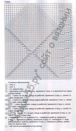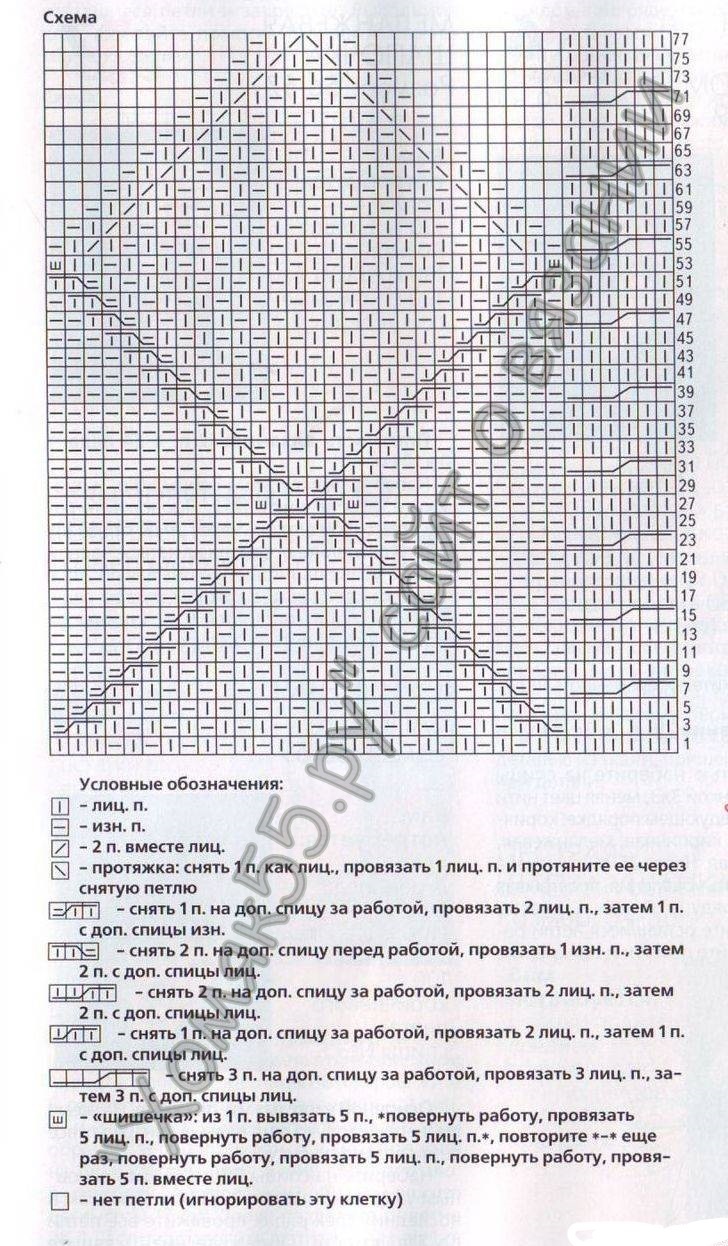 Рельефный узор: вяжите по схеме. На схеме приведены только лиц. ряды - в изн. рядах все петли вяжите по рисунку.