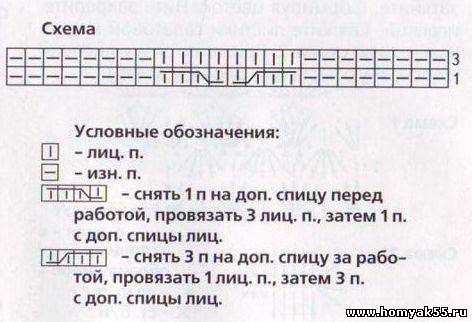 Узор с косами: вяжите по схеме, на которой приведены только лиц. ряды. В изн. рядах все петли вяжите по рисунку.