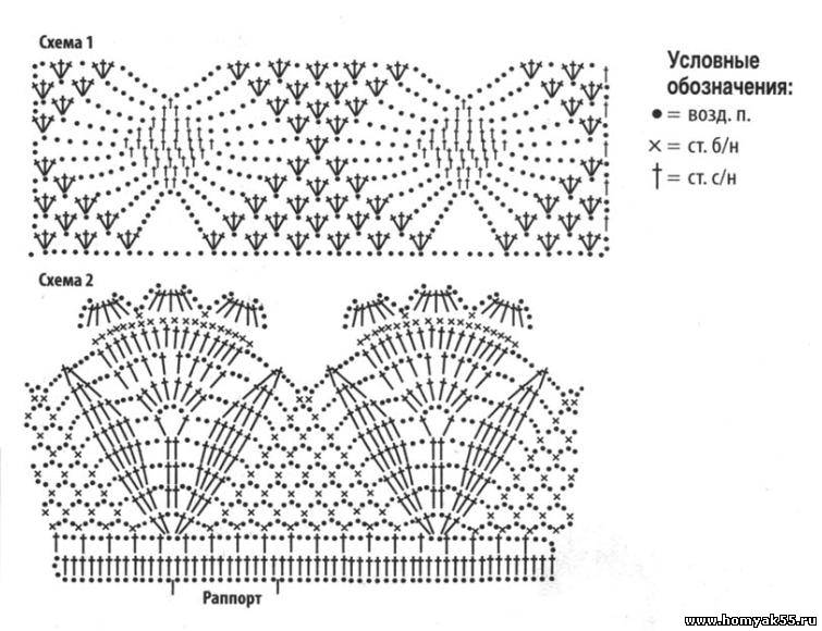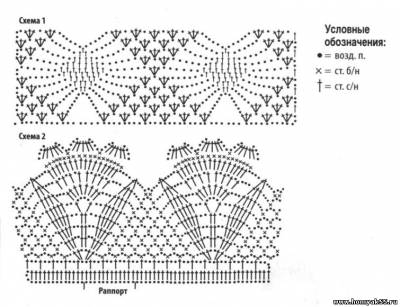 Изделие выполнено круговыми рядами. Связать цепочку из 190 ВП крючком №2,5, замкнуть в кольцо соединительным столбиком (СС). Затем вяжите столбиками без накида (СБН), провязывая в начале каждого ряда 1 ВП для подъема. Свяжите таким образом 10 см. После этого смените крючок №2,5 на №3 и сделайте в следующем ряду равномерные прибавления в количестве 70 петель. Затем продолжите работу ажурным узором по схеме 1.Связав 15 см ажурным узором, опять смените крючок на №4 и продолжите вязание тем же ажурным узором. Связав 48 см от начала работы свяжите кружевную кайму по схеме 2. С изнаночной стороны пояса пришейте эластичную тесьму или широкую резинку. $CUT$