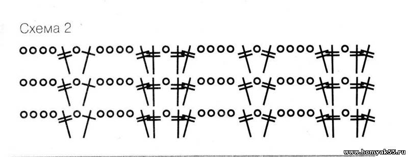 Юбка вяжется от пояса по кругу узором «ананасы» до необходимой длины. Когда основное полотно готово, приступаем к оформлению пояса (схема 2). Для шнура связать цепочку из ВП около 1 м длиной. Обвязать СБН. Шнур продеть в пояс.
