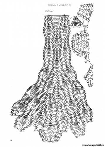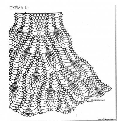 Юбку вяжите от талии вниз по кругу узором "ананас". Размеры указаны на схеме, но если у вас другая пряжа, крючок, то нужно связать образец и рассчитать количество петель для своих размеров. Расширение юбки идет за счет клиньев двумя способами: спереди и сзади согласно схеме 1, на которой показана вся работа (расширение выполняется дважды), и вдоль боковых линий согласно схеме 1а, на которой показана часть работы (расширение выполняется три раза). Вы можете расширить или сделать юбочку прямой.$CUT$