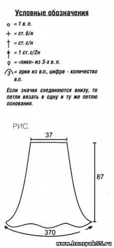 Размеры в готовом виде - по линии талии - 74 см (этот размер можно регулировать поясом-шнуром), длина - 87 см, размер окружности по нижнему краю - 370 см.