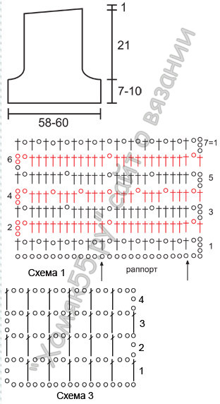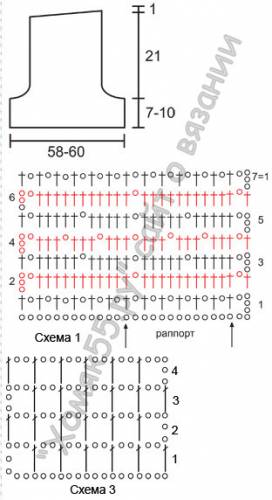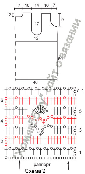 Наберите 83 ВП и вяжите по схеме № 2. Провязав 42 см (6 фрагментов), соедините обе части и продолжайте вязать по схеме № 2 на всех петлях, оставив по середине переда разрез.Лиф