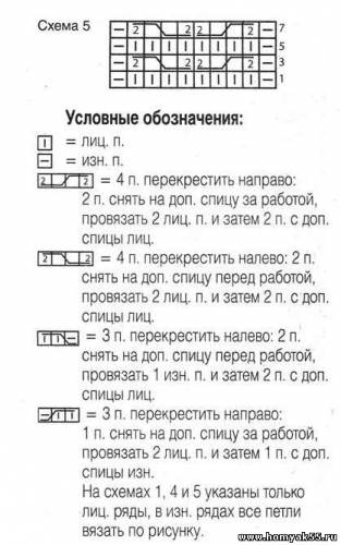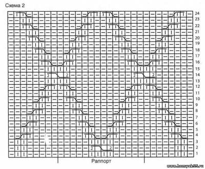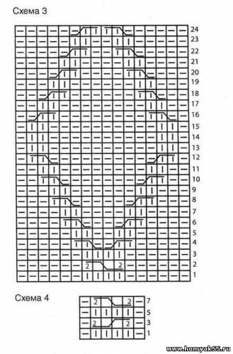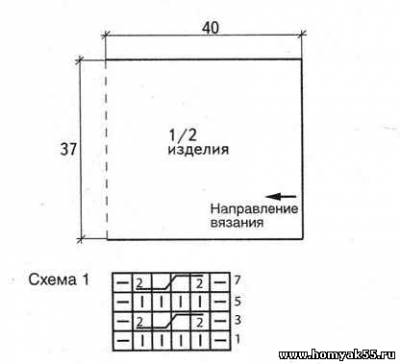 Изделие вяжется в поперечном направлении. На спицы наберите 88 петель и вяжите, распределяя петли следующим образом: кром. петля, 1 раппорт узора 1, 3 раппорта узора 2, 1 раппорт узора 1, 1 раппорт узора 3, 1 раппорт узора 4, 1 раппорт узора 5, 1 раппорт узора 1, кром. петля. В изн. рядах все петли вяжите по рисунку. На высоте 80 см закройте петли по рисунку. Выполните шов.$CUT$