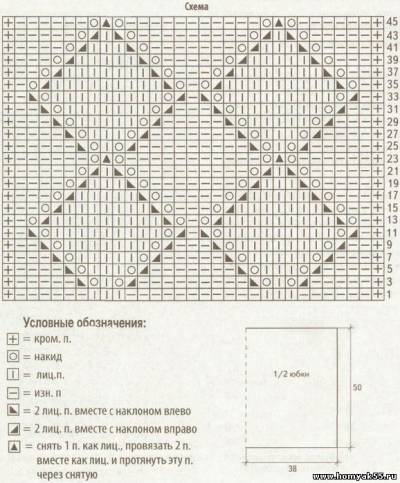 Плотность вязания ажурным узором: 26 петель х 40 рядов = 10 х 10 см.