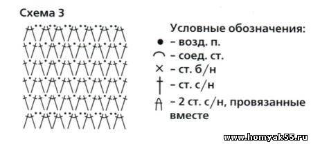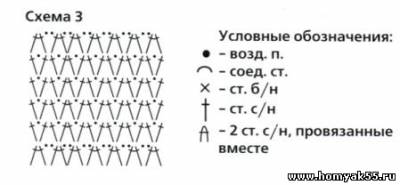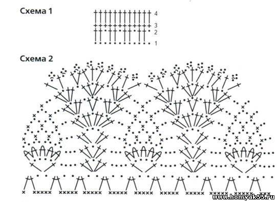 Наберите 160 воздушных петель (ВП) и замкните получившуюся цепочку в кольцо, далее продолжите работу по схеме 1, при этом повторите 4-й ряд 9 раз, после чего свяжите 1-ю оборку по схеме 2. Затем *прикрепить под оборку нить и связать 5 рядов по схеме 3, затем опять связать ажурную оборку по схеме 2*, повторите раппорт между звездочками 3 раза. Затем свяжите шнурок "гусеничку" . Шнур должен быть размером примерно 126 см, и вденьте его в дырочки узора по верхнему краю.Журнал "Вязание модно и просто - Вяжем детям"