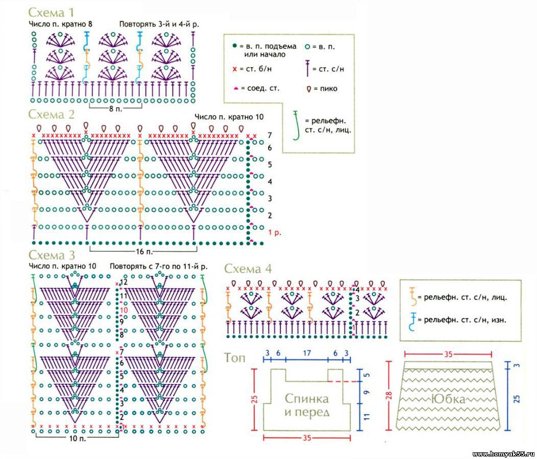 Вязать по кругу. Нитью бежевого цвета набрать цепочку из 190 ВП и вязать узором по схеме 3, учитывая, что каждая след. полоса лепестков начинается с предпоследнего ряда предыдущей полосы, оставляя последний ряд свободным. Связать всего 7 полос лепестков и обрезать нить. Обвязать свободный край начальной цепочки отделкой по схеме 4, совмещая РСН отделки с РСН юбки и выполняя последний ряд отделки нитью оливкового цвета. Общая высота около 28 см.