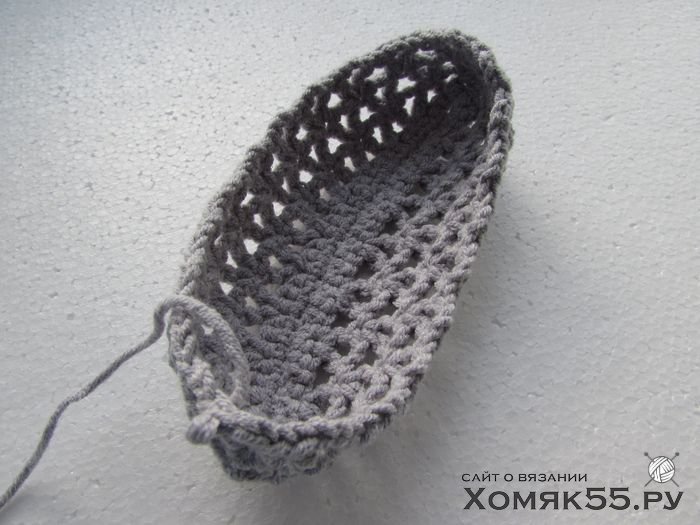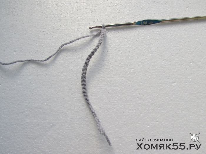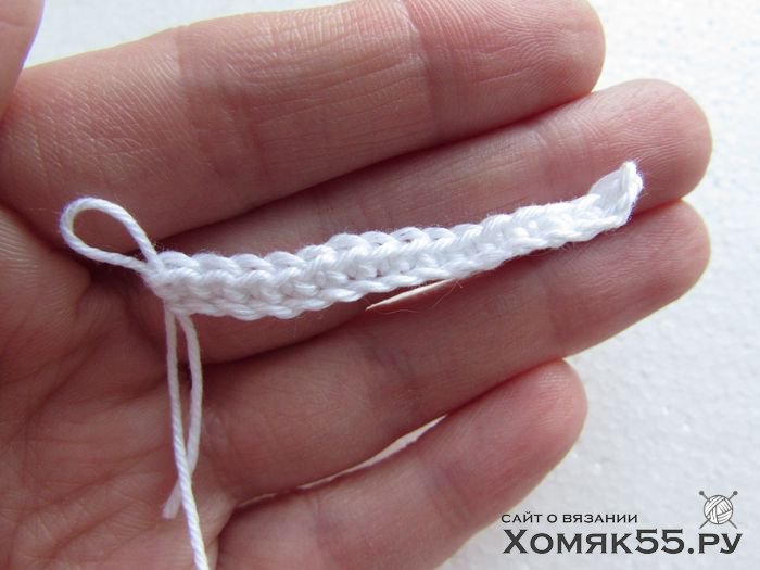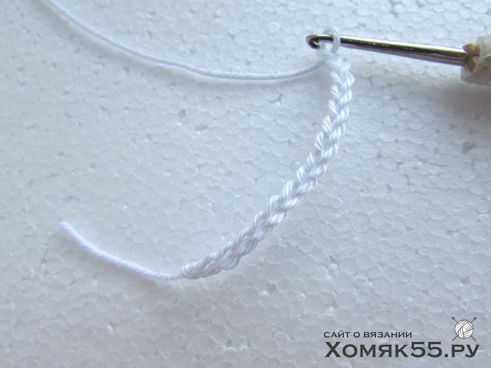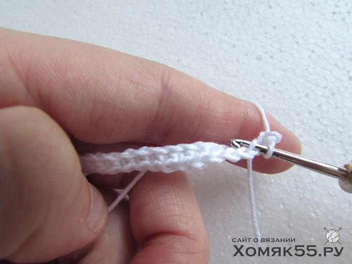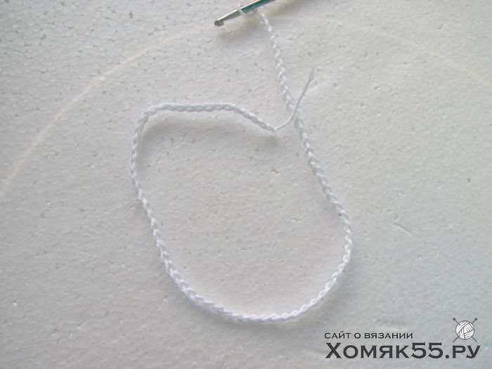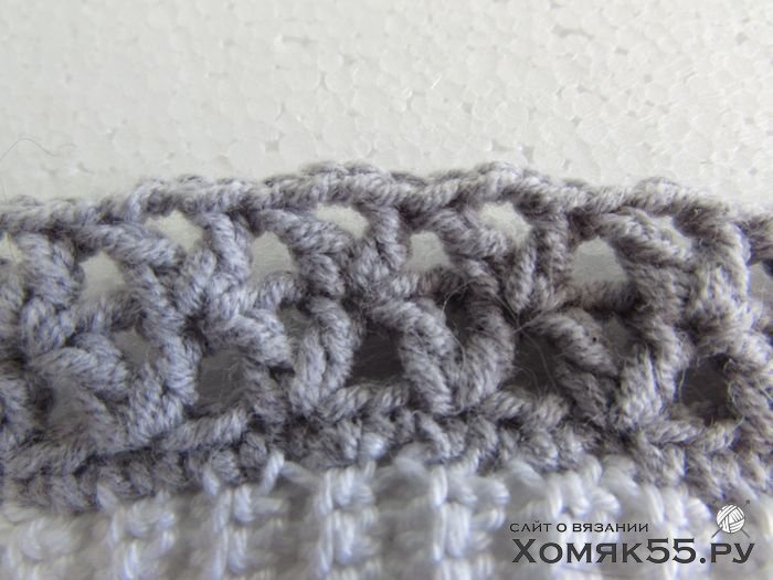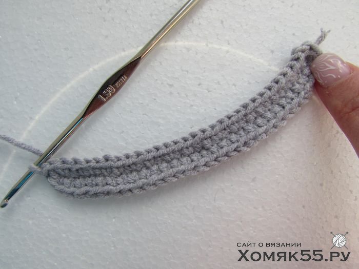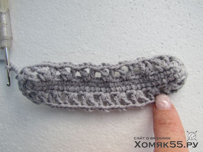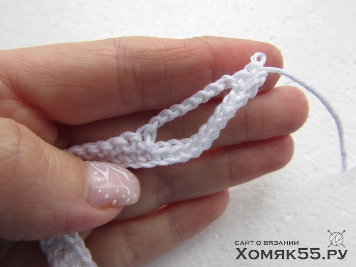 Провязываем 1 ряд столбиков без накида, после чего поворачиваем вязание, вяжем 2 столбика без накида, а затем цепочку из 5 воздушных петель, которую закрепляем столбиком без накида через 5 петель.
