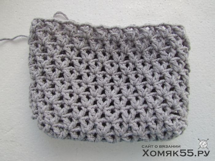 Чтобы связать «крышку» у сумки, при вязании очередного ряда делаем узор только до половины сумочки, после чего поворачиваем вязание и вяжем ряд в обратную сторону. И так 5-6 рядов.