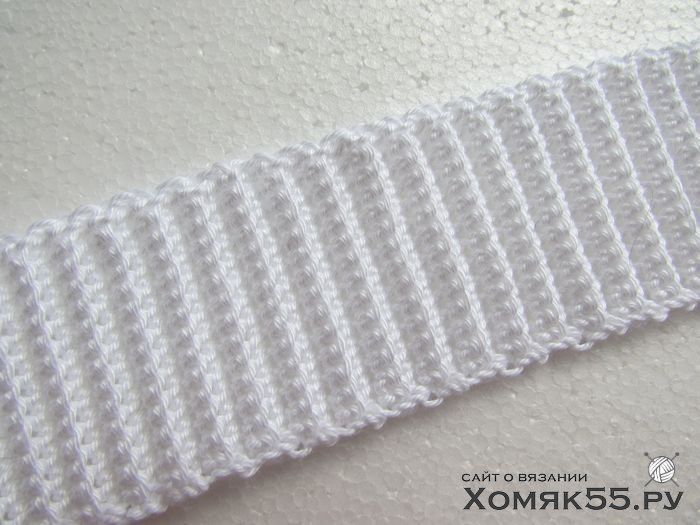 Далее вяжем точно так же до конца ряда. Поворачиваем вязание и снова повторяем узор. Аналогичным образом вяжем множество рядов, чтобы получилась длинная полоска. Длина этой полоски будет равна обхвату талии ребенка минус 2 см.
