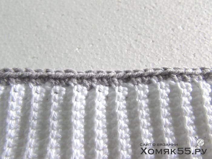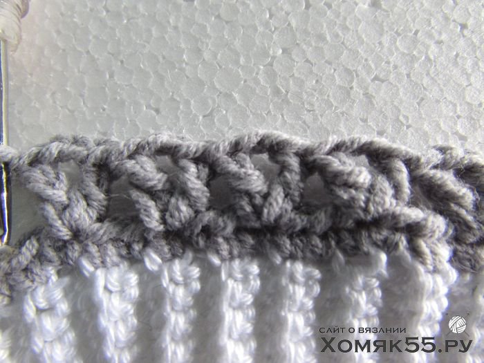 Как только резинка будет готова, связываем два конца резинки вместе. Отрываем нить и присоединяем пряжу светло-серого цвета. После этого провязываем 1 ряд столбиков без накида по всей окружности резинки. Не забываем при вязании аккуратно спрятать нитку, которую мы оторвали ранее после завершения вязания резинки.
