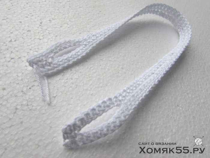 Провязываем столбики без накида, не довязывая их до конца ряда 7 петель. Снова вяжем цепочку из 5 воздушных петель, после чего прикрепляем ее столбиком без накида. Последнюю петлю ряда снова вяжем столбиком без накида. В итоге у вас должен получиться ремешок с двумя отверстиями на концах.