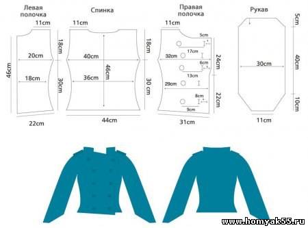 Обвязать края полочек и воротник 1 рядом полустолбиков с накидом. Отогнуть 2 см по краю правой полочки на изнанку и подшить. Отогнуть 2 см по нижнему краю жакета на изнанку и подшить. Обвязать 10 пуговиц и пришить их следующим образом: 5 пуговиц на левую полочку на расстоянии 6,5 см от внутреннего края полочки напротив отверстий для пуговиц на правой полочке и еще 5 декоративных пуговиц на правую полочку (см. выкройку).