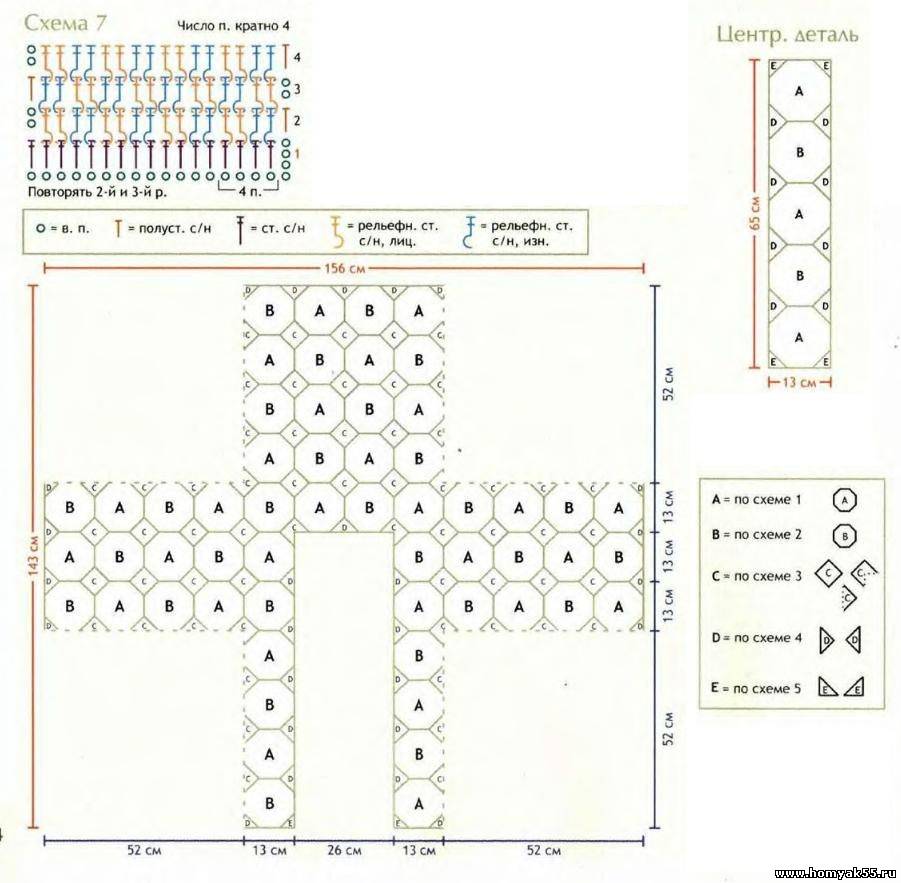 Для центральной детали каждой полочки нитью светло-коричневого цвета связать по 3 мотива по схеме 1, по 2 мотива по схеме 2, нитью бежевого цвета по 8 мотивов по схеме 4 и по А мотива по схеме 5 и соединить их так же.