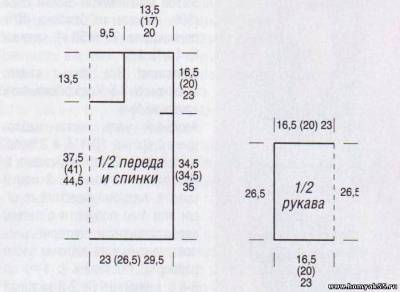 Вязать так же, но с вырезом горловины. Для этого через 37,5 см = 34 ряда (41 см = 37 рядов) 44,5 см = 40 рядов от наборного края оставить непровязанными средние 2 + с обеих сторон 1/2 раппорта (3 раппорта) 2 + с обеих сторон 1/2 раппорта минус каждый раз 1 начальная петля для симметрии и обе стороны закончить раздельно на высоте спинки на оставшихся 1 1/2 раппортах (2 раппортах) 2 1/2 раппортах + начальных или конечных петель плеча с каждой стороны.