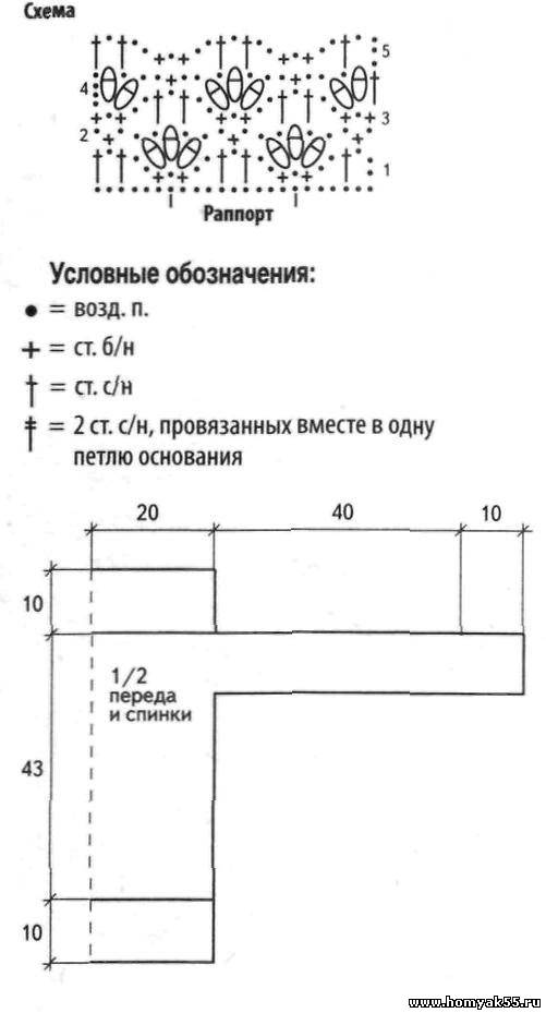 Крючком наберите 34 ВП, и вяжите по схеме прямоугольник высотой 43 см, затем закройте петли.