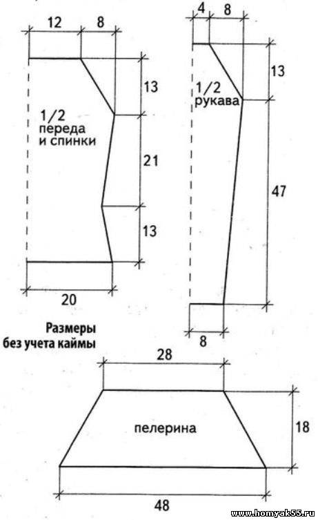 Выполните швы реглана, боковые швы и швы рукавов. Обвяжите низ кофточки и рукавов по схеме обвязки 1. Обвяжите нижний край пелерины по схеме обвязки 2. Пришейте верхний край пелерины к вырезу горловины.