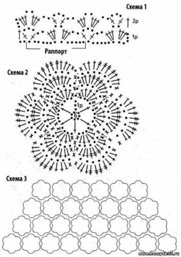 Свяжите 60 роз по схеме 2. Сшейте из них две детали пелерины, располагая розы по схеме 3. Соедините обе детали пелерины по боковым скосам.