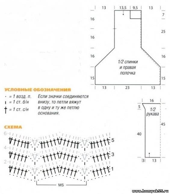 Узор из зигзагов: число петель кратно 14 + 1 + 3 ВП подъёма. Вязать по схеме. Начинать с петель перед раппортом, повторять петли раппорта, заканчивать петлями после раппорта. Связать 1 раз с 1-го по 4-й ряды, затем повторять 3-й + 4-й ряды. В 5-м + 6-м рядах указаны прибавления. Для наглядности прибавленные петли выделены (2 прибавленные петли в каждом раппорте).