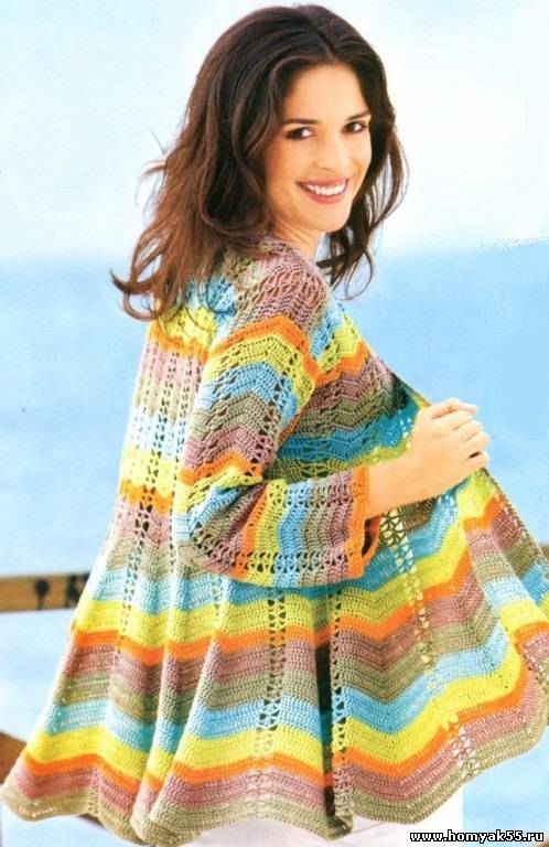 Роскошный летний жакет выполненный крючком узором зиг-заг с летящим силуэтом и радужной расцветкой, он будет хорош в любой цветовой гамме и даже однотонным.