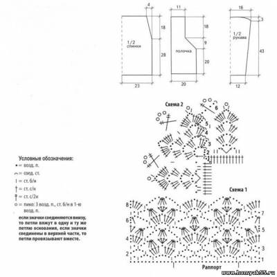Наберите цепочку из 52 ВП + 1 ВП подъема и вяжите основным узором по схеме 1. Для скоса выреза горловины убавьте с одной стороны ряда в 27-м ряду - 3 петли и в 28-34-м рядах - по 2 петли. Одновременно с убавлениями для скоса выреза сделайте убавления с другого конца ряда для проймы, аналогично убавлениям для спинки, но с одной стороны.