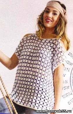 Этот пуловер крючком в свободном стиле с отверстиями на плечах не заменим в летнюю жару, он будет пропускать воздух благодаря своему узору и подарит ощущение комфорта.