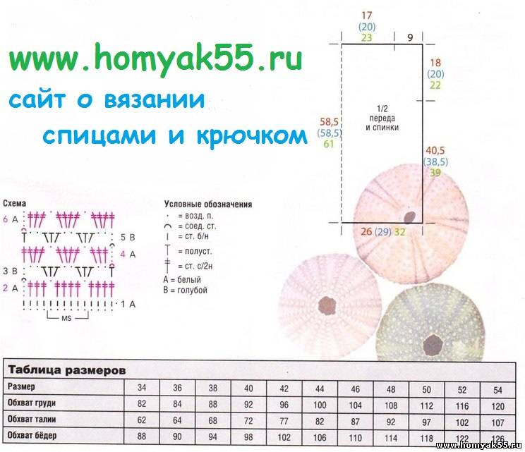 Выполнить боковые швы, при этом по 18 (20) 22 см вверху оставить для пройм открытыми. Плечевые швы выполнить на 9 см. Для перемычек оставить средние 6 групп из ССН и отметить с обеих сторон следующую группу из ССН. Отмеченные ССН + с обеих сторон по 2 петли обвязать белой нитью ССН = 8 ССН, при этом в 1-м ряду первые и оба последних ССН провязать вместе = 6 ССН.