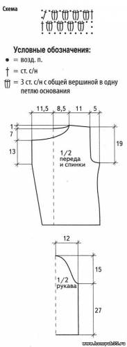 Наберите цепочку из ВП длиной 24 см и вяжите по схеме. На высоте 27 см от начала вязания вывяжите окат рукава в согласовании с выкройкой.Сборка