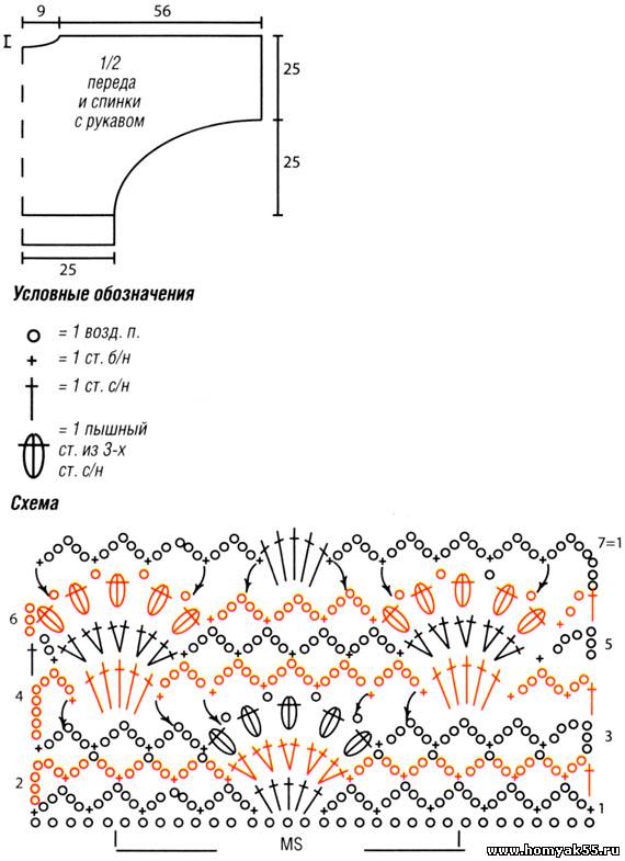 Набрать крючком 110 ВП и вязать по схеме. Через 8 см от наборного края прибавить в каждом ряду с обеих сторон по 7 ВП. Внимание! Добавленные петли включать в рисунок. Через 25 см продолжить работу без прибавлений. Через 25 см работу отложить.
