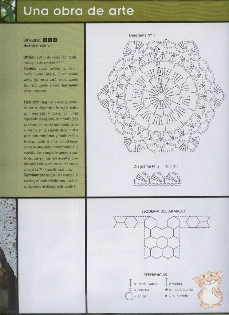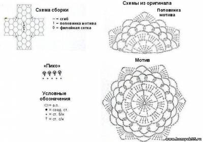 Связать 38 круговых мотивов и 8 половинок мотива, соединяя их друг с другом при вывязывании последнего ряда (см. схему сборки). Связав все мотивы, заполнить филейной сеткой соответствующие участки, указанные на схеме сборки. Обвязать низ рукавов и низ кофточки 1 рядом СБН и 1 рядом "рачьего шага". Обвязать горловину 2 рядами филейной сетки и 1 рядом "пико".