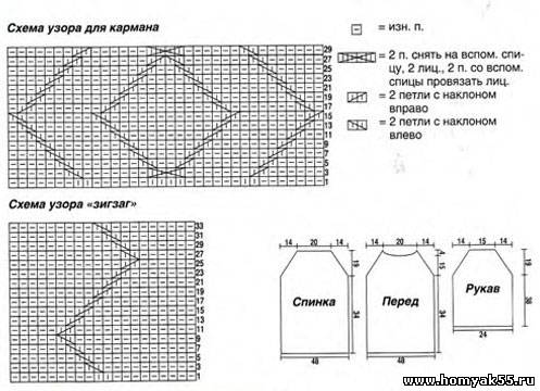 На спицы №3 набрать 60 петель. Петли распределить следующим образом: 1-й ряд: 1 кром. петля, 11 изн. петель, 2 лиц. петли, 6 изн. петель, 2 лиц. петли, 6 изн. петель, 4 лиц. петли, 6 изн. петель, 2 лиц. петли, 6 изн. петель, 2 лиц. петли, 11 изн. петель, 1 кром. петля.3-й - 45-й ряды: вязать согласно схеме кармана (1,5 вертикальных раппорта).