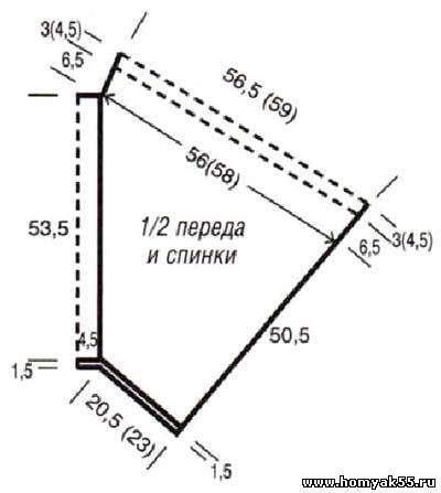 Вязать так же, но без плечевой кокетки. Для этого оставшиеся 96 (100) петель отложить через 57 см * 154 ряд от планки.
