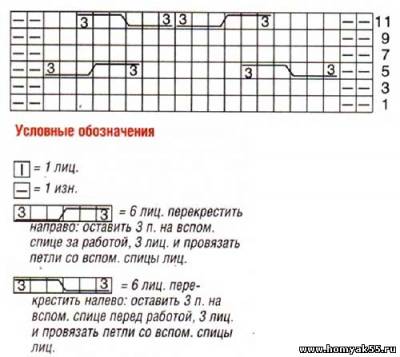 Коса (из 22 петель): вязать по схеме, на которой приведены только лиц. ряды, в изн. рядах все петли вязать по рисунку. Повторять с 1-го по 12-й ряды.
