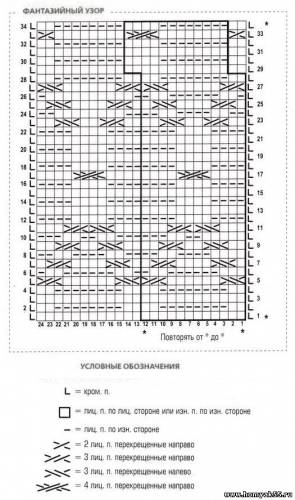 Фантазийный узор: число петель кратно 12 + 1 кром. петля с каждой стороны. Вязать по схеме.