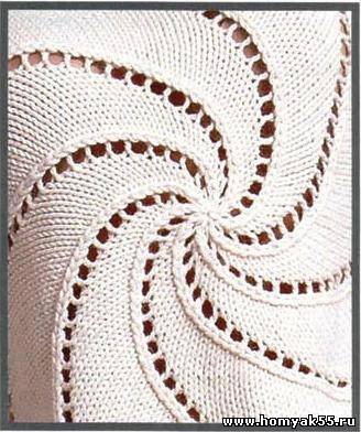 Кайма: связать круговыми рядами 2 ряда лиц. гладью, при этом по линиям, обозначенным на выкройке голубым цветом, 1-й ряд вязать так: *1 накид, провязать 2 петли вместе лиц., повторять от *.