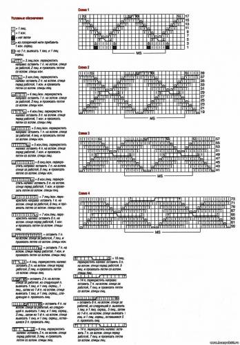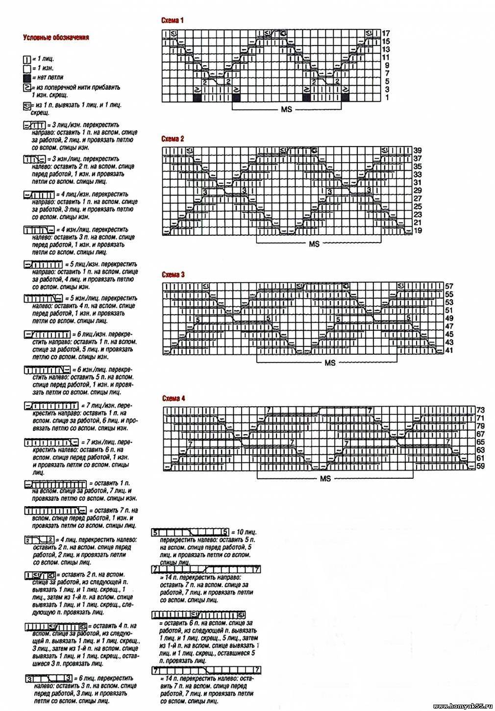 Основной узор (схемы 1 - 4): сначала число петель кратно 12 + 2 кром. На всех схемах приведены только лиц. ряды, в изн. рядах петли вязать по рисунку. Начинать с 1 кром. и петель перед раппортом, повторять раппорт, заканчивать петлями после раппорта и 1 кром. Сначала вязать по схеме 1, при этом связать 26 раз 1-й и 2-й ряды и 1 раз с 3-го по 18-й ряды. Затем связать по 1 разу обозначенные ряды схем 2, 3 и 4, после этого повторять с 59-го по 74-й ряды.