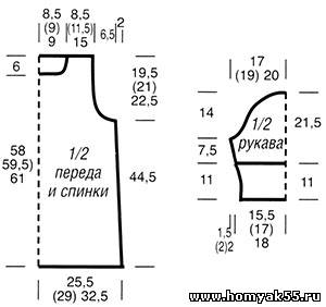 17 петель и 25 рядов = 10 х 10 см; средняя плотность с 53-го ряда и на рукавах: 30 петель и 27 рядов = 10 × 10 см.