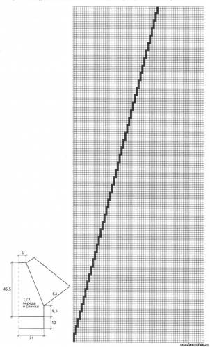 Наберите на спицы 138 петель и вяжите резинкой 2 x 2.$CUT$ Довяжите до 45-го ряда и начинайте вязать лиц. гладью. Провяжите еще 45 рядов и начинайте вязать по схеме 1. Закончите на 270-м ряду, закройте петли. Свяжите спинку аналогично.