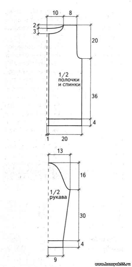 Наберите 40 петель и вяжите 4 см резинкой 2 x 2, далее - лицевой гладью, прибавляя с обеих сторон для скоса рукава через каждые 9 см по 1 петле. На высоте 34 см от начала вязания закройте с обеих сторон по 1 петле в 1, 2, 3, 5, 7, 9, 15, 19, 22, 25, 27, 29, 31, 34-м рядах, 4, 6, 8, 10-14, 16-18, 20-24, 26, 28, 30-й ряды вяжите без убавлений, в 35-38-м рядах убавьте по 2 петли, второй рукав свяжите аналогично.